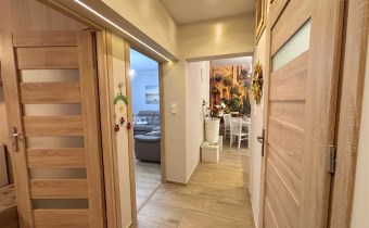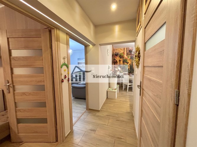 Wysoki parter: holl, dwa pokoje z osobnym wejściem (połączone, mogą być pod zamieszkanie lub działalność gosp.), oraz mieszkanie z osobnym wejściem; przedpokój, sypialnia, duży salon z balkonem, duża kuchnia (umeblowana i wyposażona), łazienka z wc (kabina prysznicowa), podłogi podgrzewane i kaloryfery.