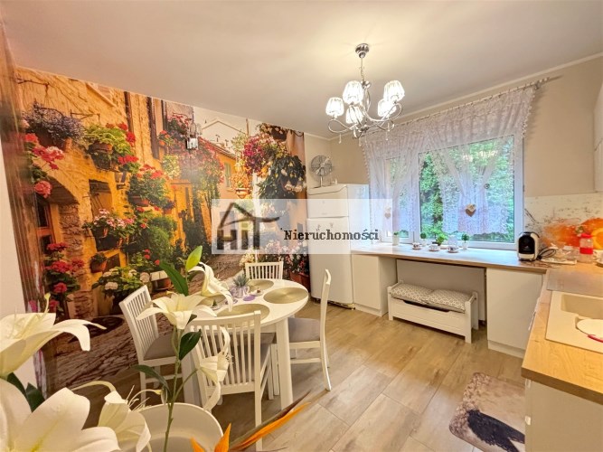 Wysoki parter: holl, dwa pokoje z osobnym wejściem (połączone, mogą być pod zamieszkanie lub działalność gosp.), oraz mieszkanie z osobnym wejściem; przedpokój, sypialnia, duży salon z balkonem, duża kuchnia (umeblowana i wyposażona), łazienka z wc (kabina prysznicowa), podłogi podgrzewane i kaloryfery.
